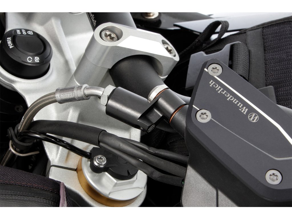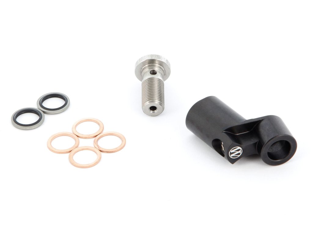 Náš vysoce kvalitní adaptér pro brzdové a spojkové vedení nabízí prodloužení přibližně o 35 mm, což se v praxi osvědčilo. K praktickému adaptéru standardně přikládáme potřebný dutý šroub a všechna potřebná těsnění. Připevňuje se přímo k příslušnému brzdovému čerpadlu nebo spojkovému peru. Hrany adaptéru jsme mírně zkosili, abychom zjednodušili připojení přívodních vedení, takže je lze vést a připojovat bez jakéhokoli napětí.