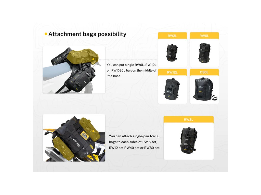 S 25litrovými suchými vaky na každé straně, které se vkládají do košíků připevněných k RW-Base, a přepracovanou cestovní taškou uprostřed (s ramenními popruhy) nabízí Enduro 80 největší všestrannost, co se týče úložné kapacity a použití. Můžete se rozhodnout použít suchý vak, nebo ho nechat stranou a košík použít na krátké výlety za palivem. Suchý vak se také roztáhne, aby se do něj vešly i předměty nepravidelných tvarů, které si můžete vzít na výlety. Plně vodotěsný, plně odolný, plně Westwind.