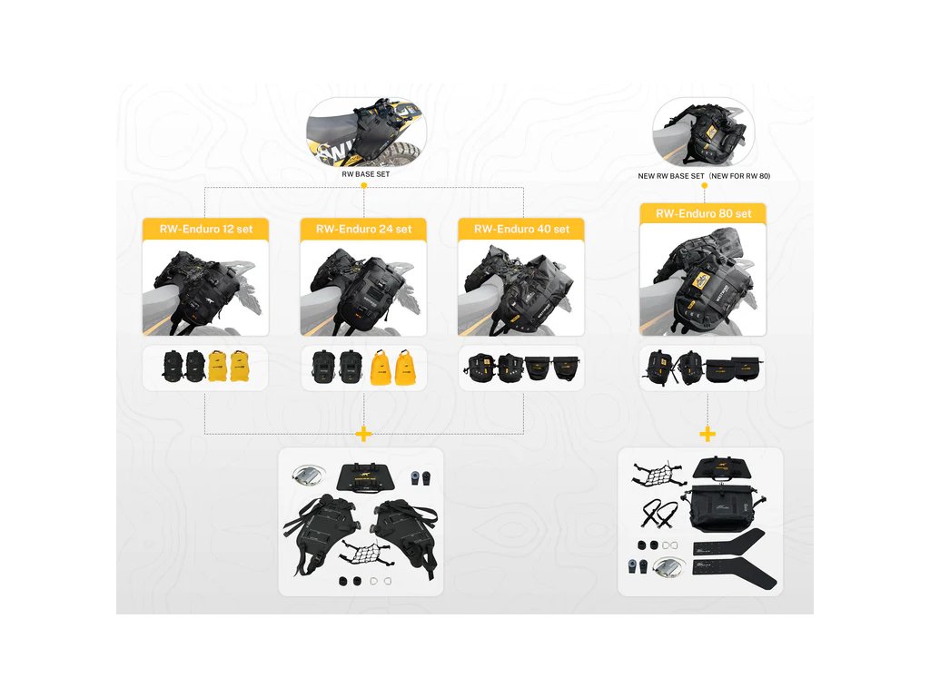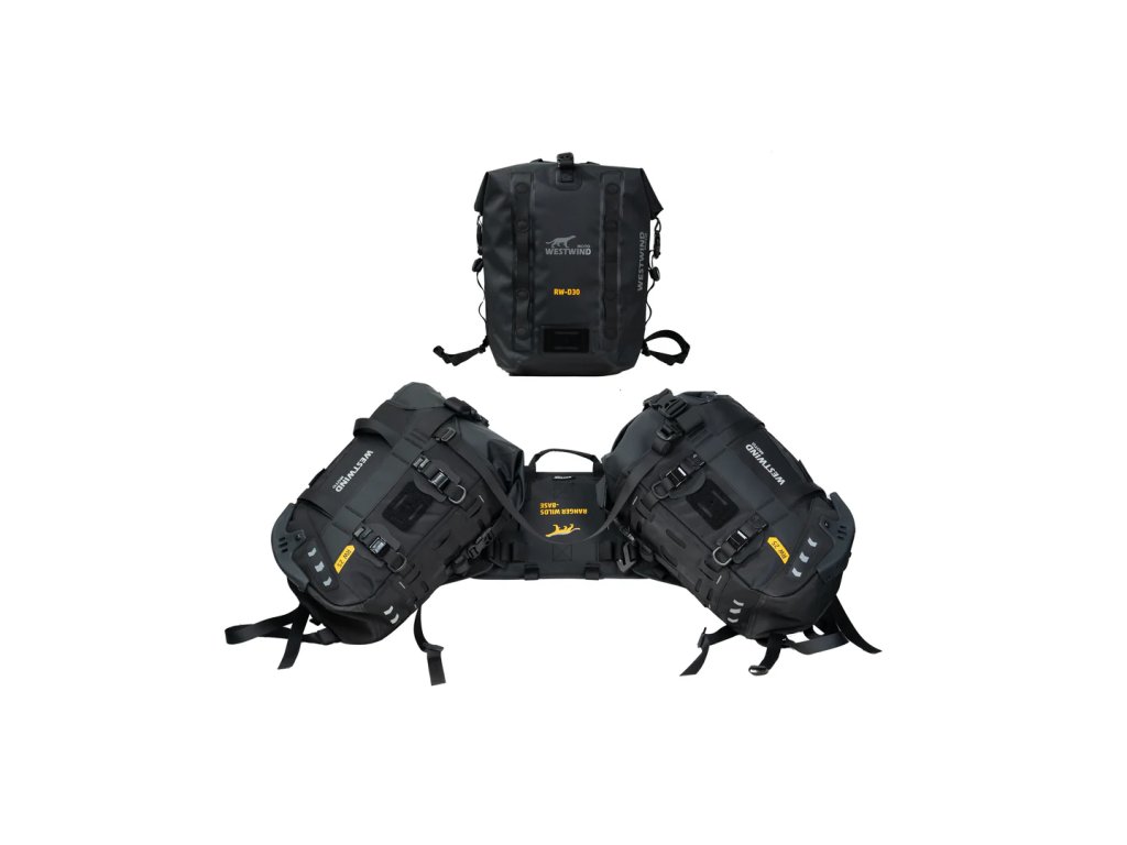 S 25litrovými suchými vaky na každé straně, které se vkládají do košíků připevněných k RW-Base, a přepracovanou cestovní taškou uprostřed (s ramenními popruhy) nabízí Enduro 80 největší všestrannost, co se týče úložné kapacity a použití. Můžete se rozhodnout použít suchý vak, nebo ho nechat stranou a košík použít na krátké výlety za palivem. Suchý vak se také roztáhne, aby se do něj vešly i předměty nepravidelných tvarů, které si můžete vzít na výlety. Plně vodotěsný, plně odolný, plně Westwind.