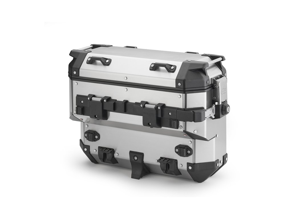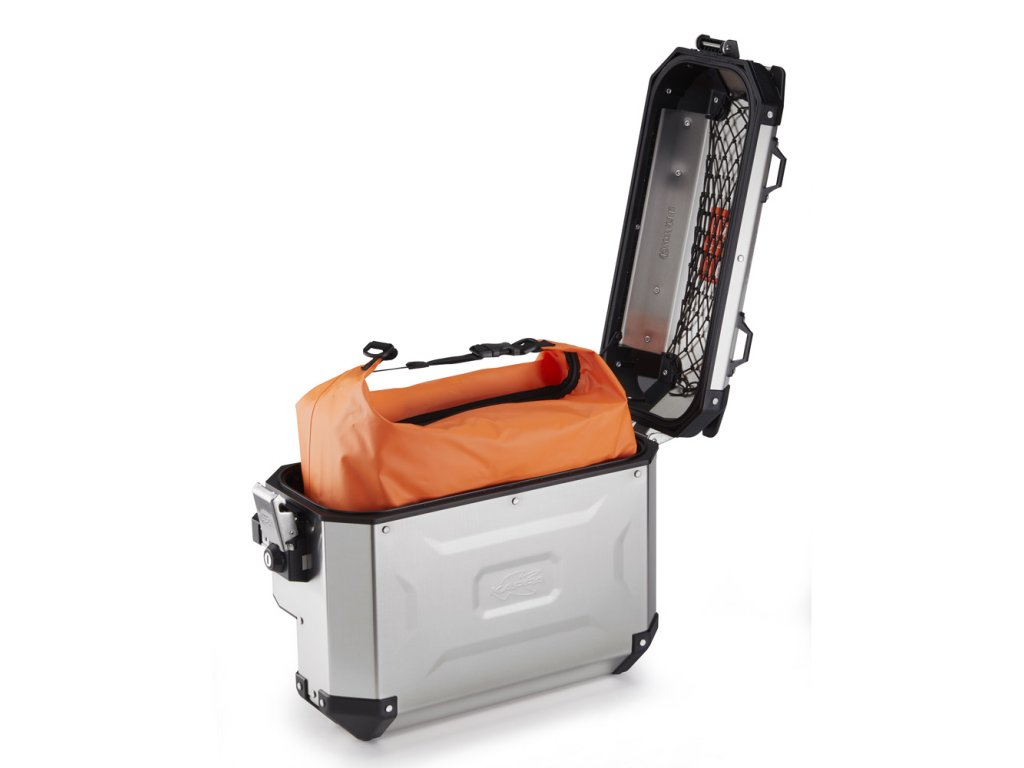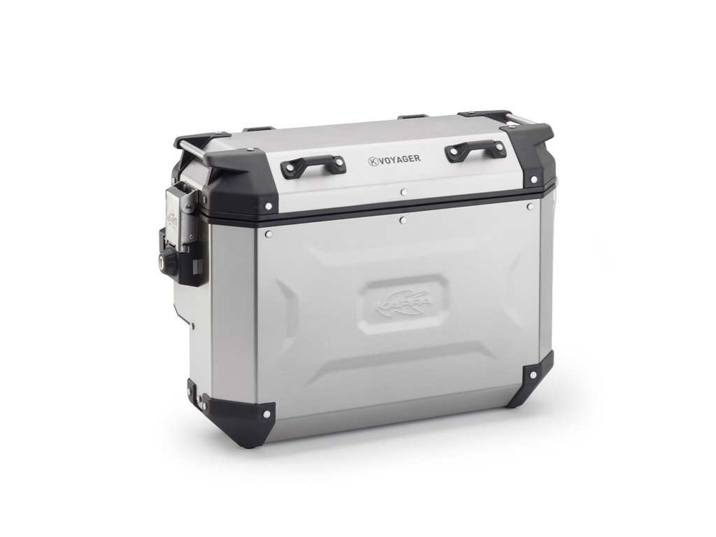 K’VOYAGER je 33 litrový přírodně šedý hliníkový boční kufr na motocykl, pravá montážní strana s výřezem pro výfukový prostor motocyklu.