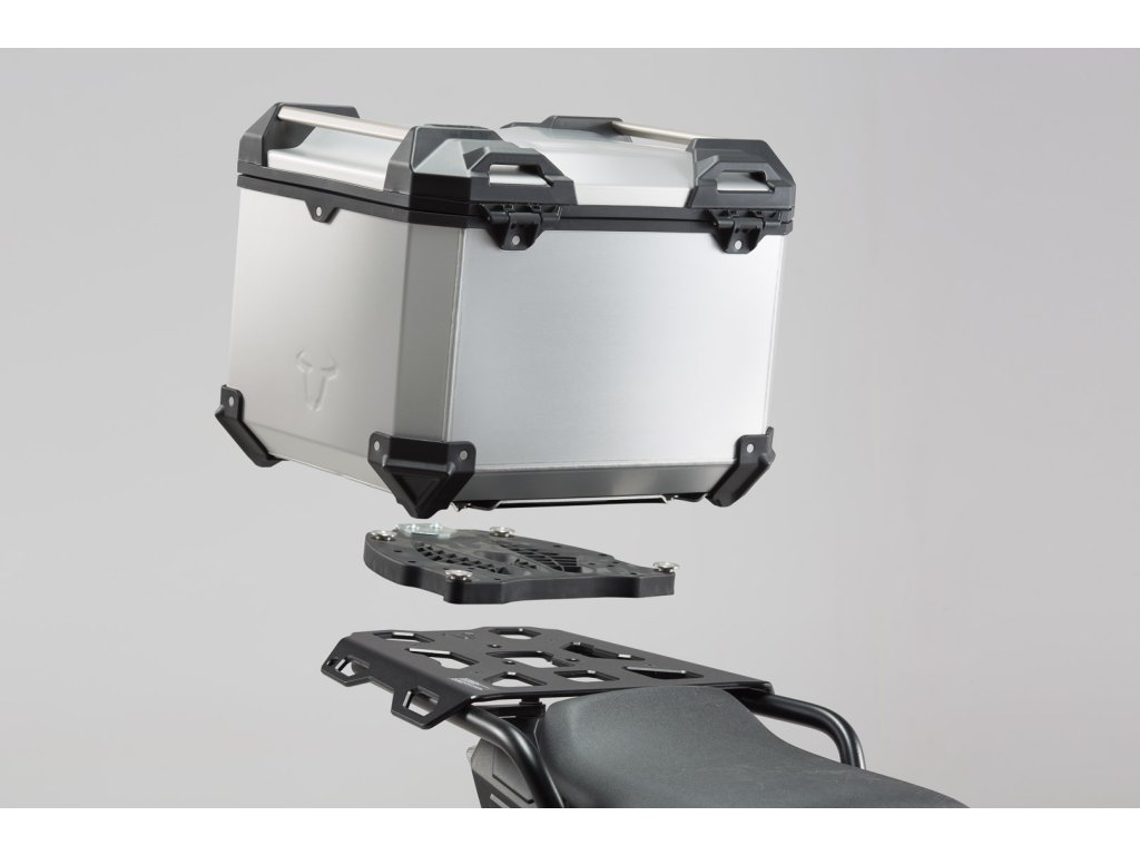 Tento systém "vše v jednom" obsahuje všechny produkty potřebné k montáži horního kufru: horní kufr TRAX ADV, ALU-RACK specifický pro kolo, deska adaptéru a sada cylindrických vložek TRAX Lock. Připraveno na silnici s hliníkovým pouzdrem, které nabízí odolnost a těsnost proti vodě a prachu, stejně jako snadnou manipulaci. Prémiový hliníkový topcase s pevností stěny 1,5 milimetru přijme jakoukoli výzvu - ať už si vezmete zavazadla na drsnou jízdu po venkově, uvolněnou plavbu po silnici nebo na krátkou cestu. ALU-RACK specifický pro kolo a deska adaptéru zajišťují bezpečné upevnění horního kufru jednoduchým posunutím na desku adaptéru a upevněním západkou. Systém je k dispozici se stříbrným nebo černým topcasem TRAX ADV (viz rozsah dodávky).