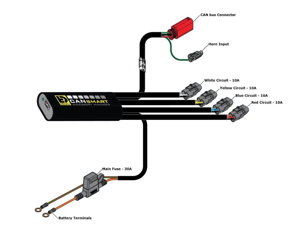 - Spínaný zdroj napájení – CANsmart™ nabízí univerzální „příslušenství“, které vám jednoduše dodává čisté spínané napájení 12 V. To znamená, že jakékoli příslušenství, které k tomuto obvodu připojíte, se bude zapínat a vypínat společně se zapalováním.