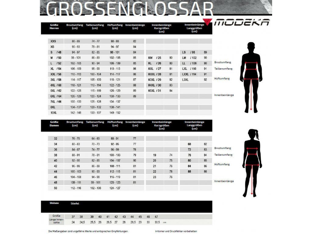Nabídka Modeky to nejsou jen materiálové inovace. Dbá také na široký rozsah velikostí. To ocení obzvláště zákazníci, kteří vzhledem ke své atypické postavě prohledali již mnoho věšáků, katalogů a internetových stránek. Od Modeky největší pánská bunda je dostupná ve velikosti 10 XL, dámská – ve velikosti 48. Mnoho modelů bund a ještě více kalhot je dostupných v nestandardních proporcích: s prodlouženými nebo zkrácenými rukávy nebo nohavicemi. Prodloužené modely budou vhodné pro štíhlé a vysoké osoby, zkrácené – pro nižší a podsaditější. U dětského oblečení byla zohledněna možnost samostatného upravování délky rukávů a nohavic.