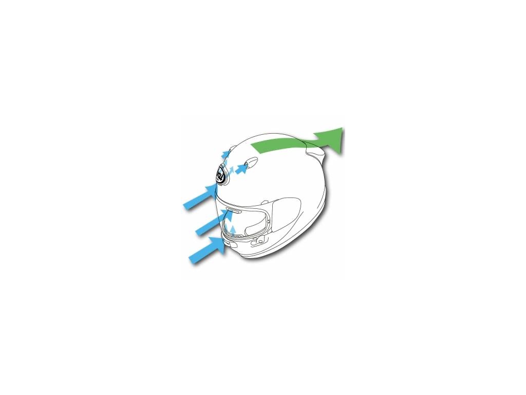 - nová, promyšlená ventilace s několika vstupy na čele, koruně i plexi štítu a s efektivním odvodem vzduchu vzadu — v praxi to znamená příjemné proudění i při pomalejších rychlostech.
