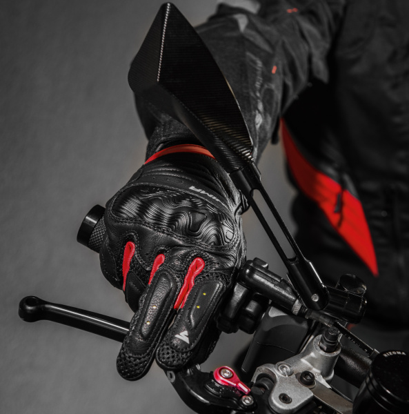 Krátké rukavice RUSH byly navrženy s odolným chráničem kloubů a pěnovými tlumiči nárazů ArmorPlus. Rukavice také obsahují panely SuperFabric® s přírodní kůží na přední dlani pro extra odolnost. Tkanina Hi-flow 3D Mesh na zadní dlani v kombinaci s perforovanou kůží zajišťuje v horkých dnech extra cirkulaci vzduchu. Ukazováček a palec jsou vybaveny technologií TouchTip ™, která je navržena pro práci se smartphony. RUSH rukavice stylově odkazují na stejnojmennou bundu.