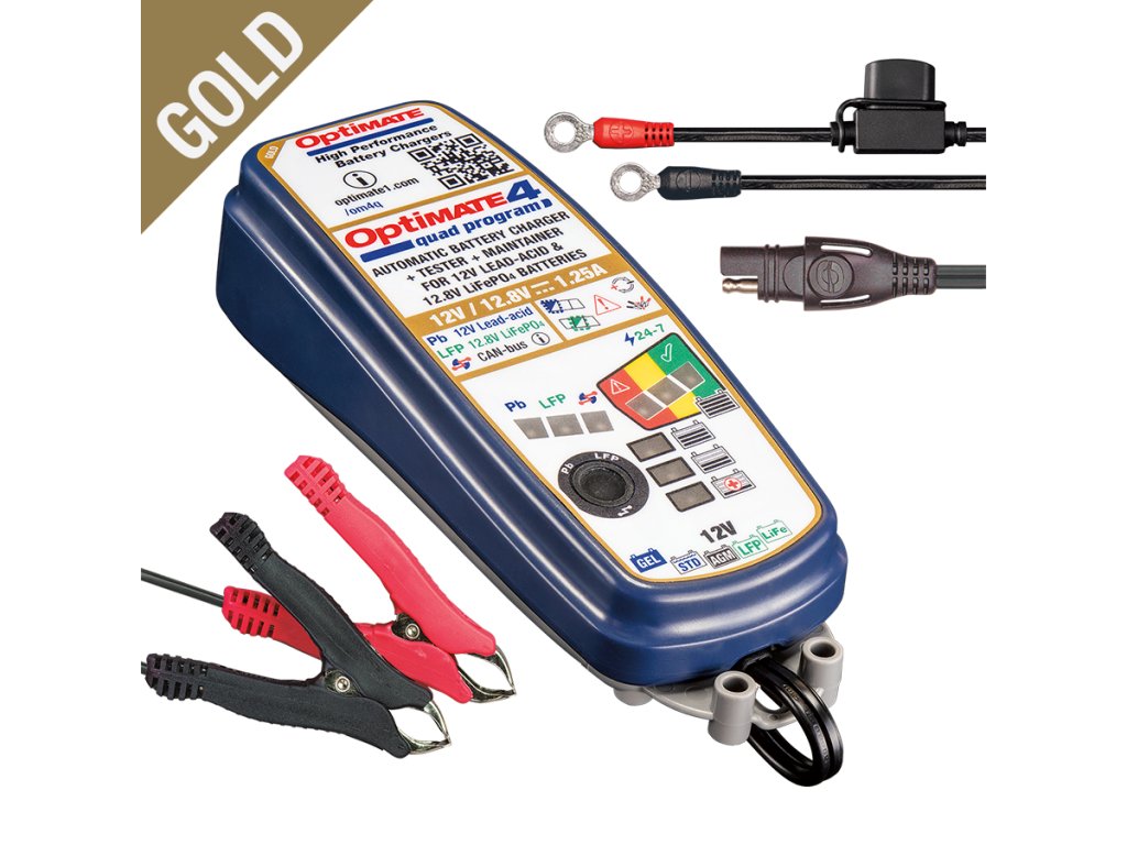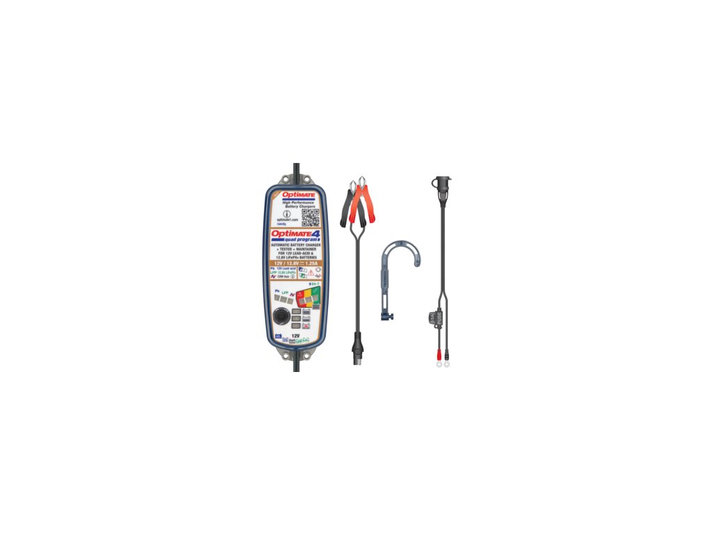 OptiMate 4 Quad Program je špičková nabíječka baterií pro high-tech 12V / 12,8V baterie ve vašem dobrodružném, turistickém, cruiserovém nebo výkonném motocyklu, čtyřkolce, side-by-side vozidle nebo vodním skútru – nejmodernější nabíječka baterií pro motorové sporty na světě!