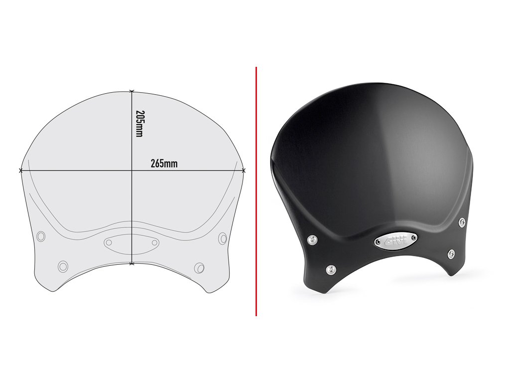 Tento štítek je možné namontovat pomocí specifické montážní sady - kupte samostatně. Univerzální štítek pro "naháče" klasického i moderního provedení. Je vyroben celý z kovu, konkrétně z anodizovaného, broušeného a lakovaného hliníku o tloušťce 2 mm. Bez plastových dílů, se stříbrnou značkou GIVI.