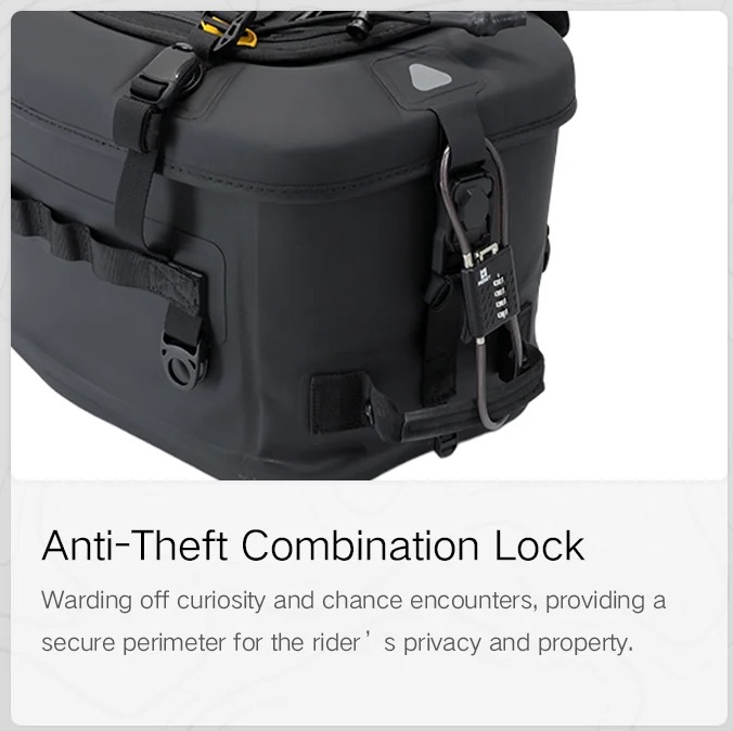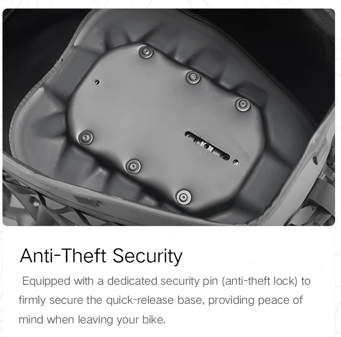 - Uzamykatelné: Při použití rychloodepínacího mechanismu lze celý mechanismus zajistit pojistným pinem, který se vkládá do mechanismu zevnitř brašny a samotnou brašnu lze uzamčít vysacím/lankovým zámkem