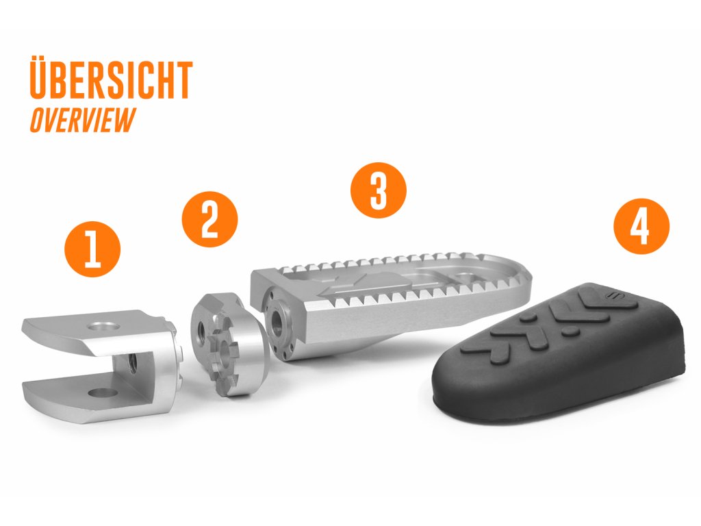 Základem systému je TENTO stříbrný nebo černý Vario kloub, který je vhodný pro příslušný model vozidla, který je namontován na konzole stupačky na motocyklu.