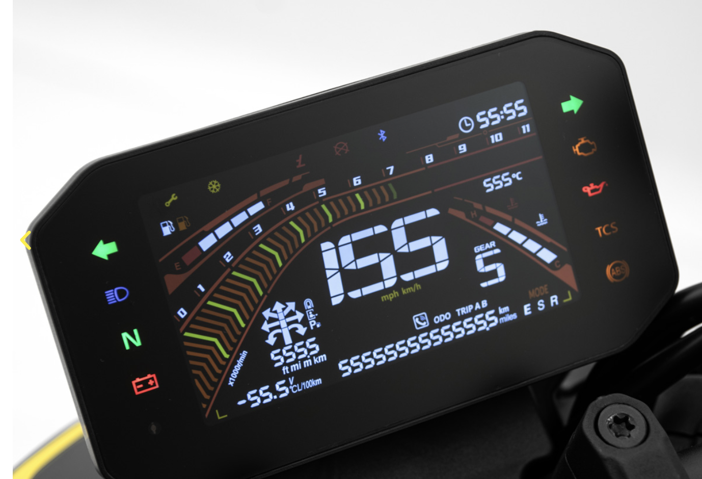 Nadchne tě i výbavička a šmrncovní vzhled. Malá ochutnávka: Sedmipalcovej barevnej displej září za každýho počasí jasně jako výsledkový tabule na staďácích. Vybrat si můžeš černej nebo modrej dres. Jeho elegantnost podtrhnou fakt pekelně krásný světla na nádrži i trojrozměrný zadáče.