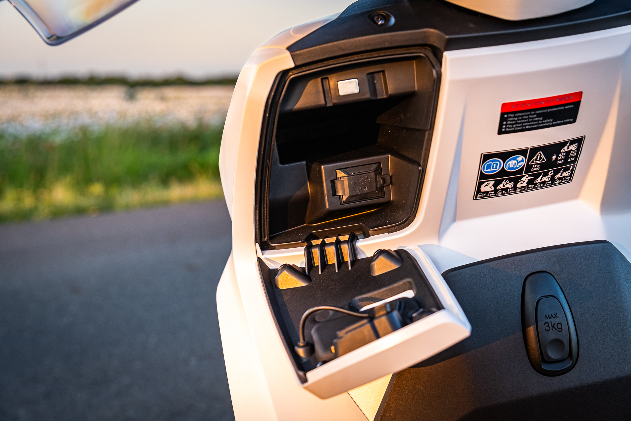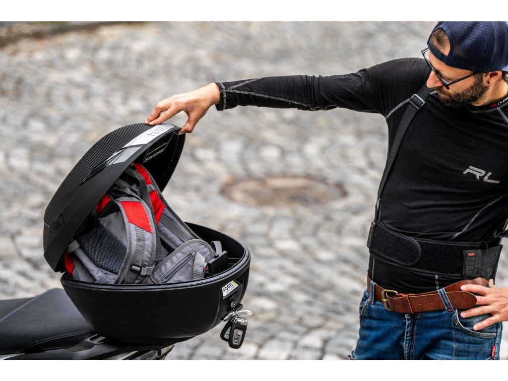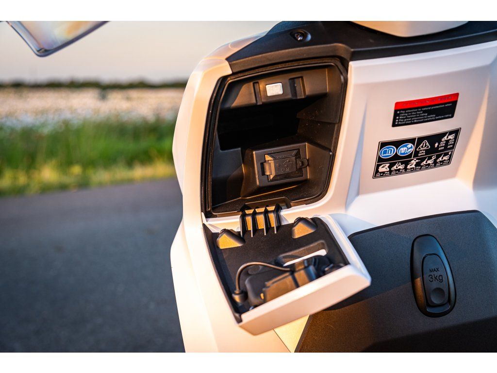 Pod sedlo hodíš běžnej nákup, případně jetku nebo menší integrálku. A kdybys vyrazil na větší nákup, už v základu dostanešzadní hliníkovej nosič s 34litrovým kufrem. Drobnosti si schováš do uzavíratelný přihrádky s USB, kterou mám v předním štítu.