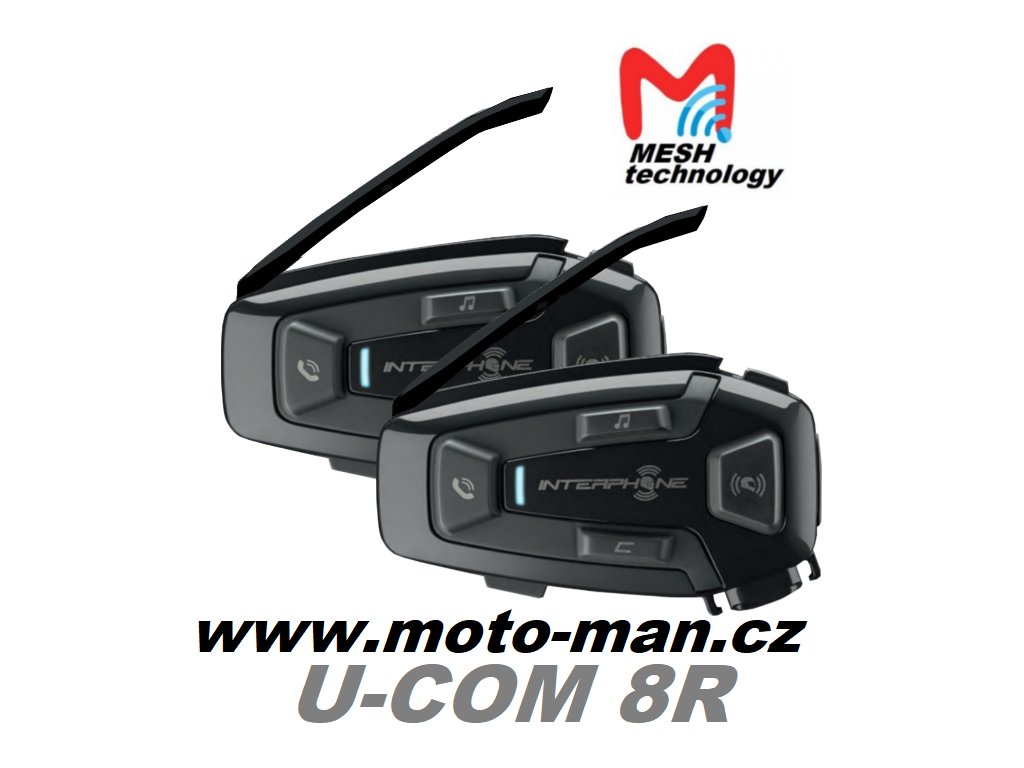 U-COM 8R nabízí dva různé režimy Sena Mesh Intercom™: Skupinový Mesh Intercom a vícekanálový otevřený Mesh Intercom. Při použití funkce Group Mesh uživatelé vytvoří soukromou skupinu, která podporuje až 24 jezdců v dosahu až 8 km (min. 6 jezdců v intervalech 1,6 km). Uživatelé jsou pozváni do sítě Group Mesh, což zvyšuje kontrolu a soukromí. Vícekanálová síť Open Mesh umožňuje jezdcům komunikovat prakticky s libovolným počtem účastníků sítě Mesh v dosahu až 5 mil / 8 km. Open Mesh nabízí také vícekanálové možnosti, k dispozici je až devět kanálů. Můžete přepínat mezi frekvencemi kanálů pro konverzaci s různými skupinami jezdců v rámci větší skupiny Open Mesh. U-COM8R je vybaven funkcí rychlého nabíjení za pouhých 1,5 hodiny, která zajistí 11,5 hodin hovoru. Přístroj je kompatibilní se všemi zařízeními vybavenými sítí Interphone a Sena Mesh, včetně např. 50S, 50R, 30K, Momentum EVO a všech zařízení Sena Bluetooth, která jsou připojena k adaptéru +Mesh.
