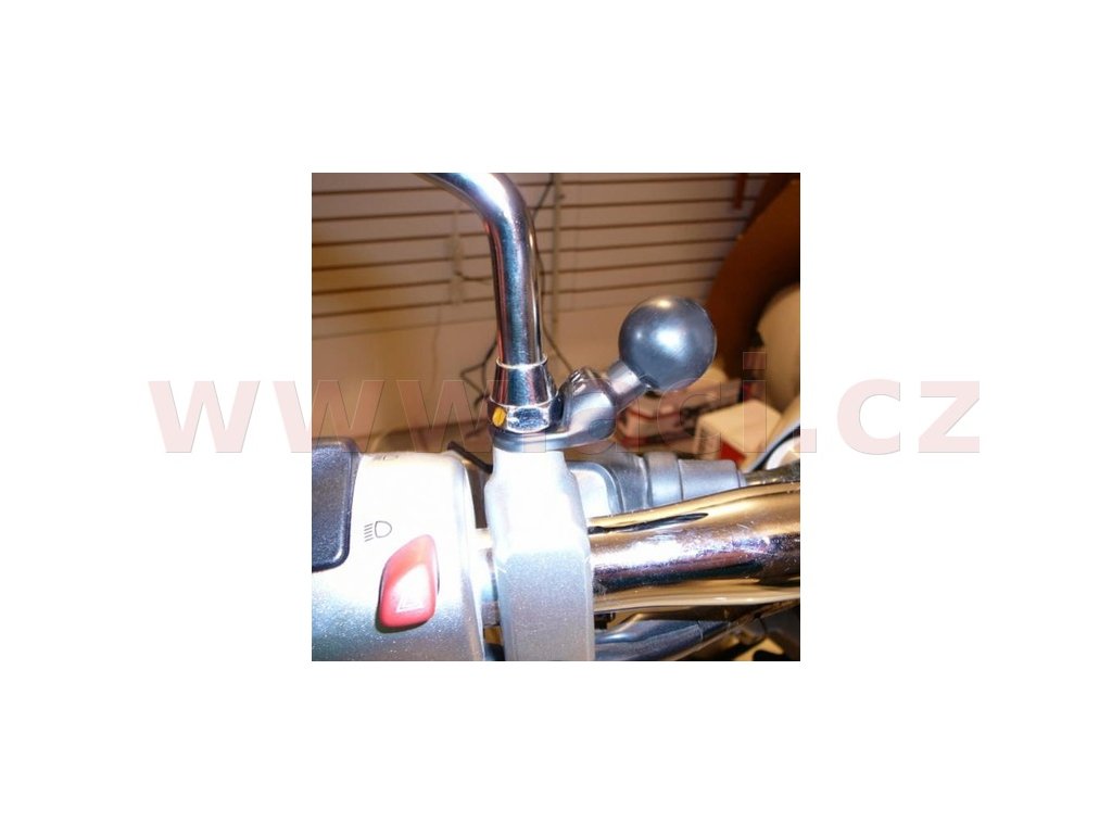 Úchyt na motorku nebo skútr na zpětné zrcátko s průměrem šroubu do 9mm. Úchyt se připevňuje mezi nohu zrcátka a řídítka, případně pod šroub, kde úchyt drží hlava šroubu. Další vhodné místo pro umístění tohoto úchytu je pod svíracím šroubem řídítek. V tomto případě doporučujeme použít podložku. Patentovaný kulový čep je vyroben z velmi kvalitní pryže tak, aby tlumil nárazy a vibrace, které by jinak byly přenášeny na upevněné elektronické zařízení.