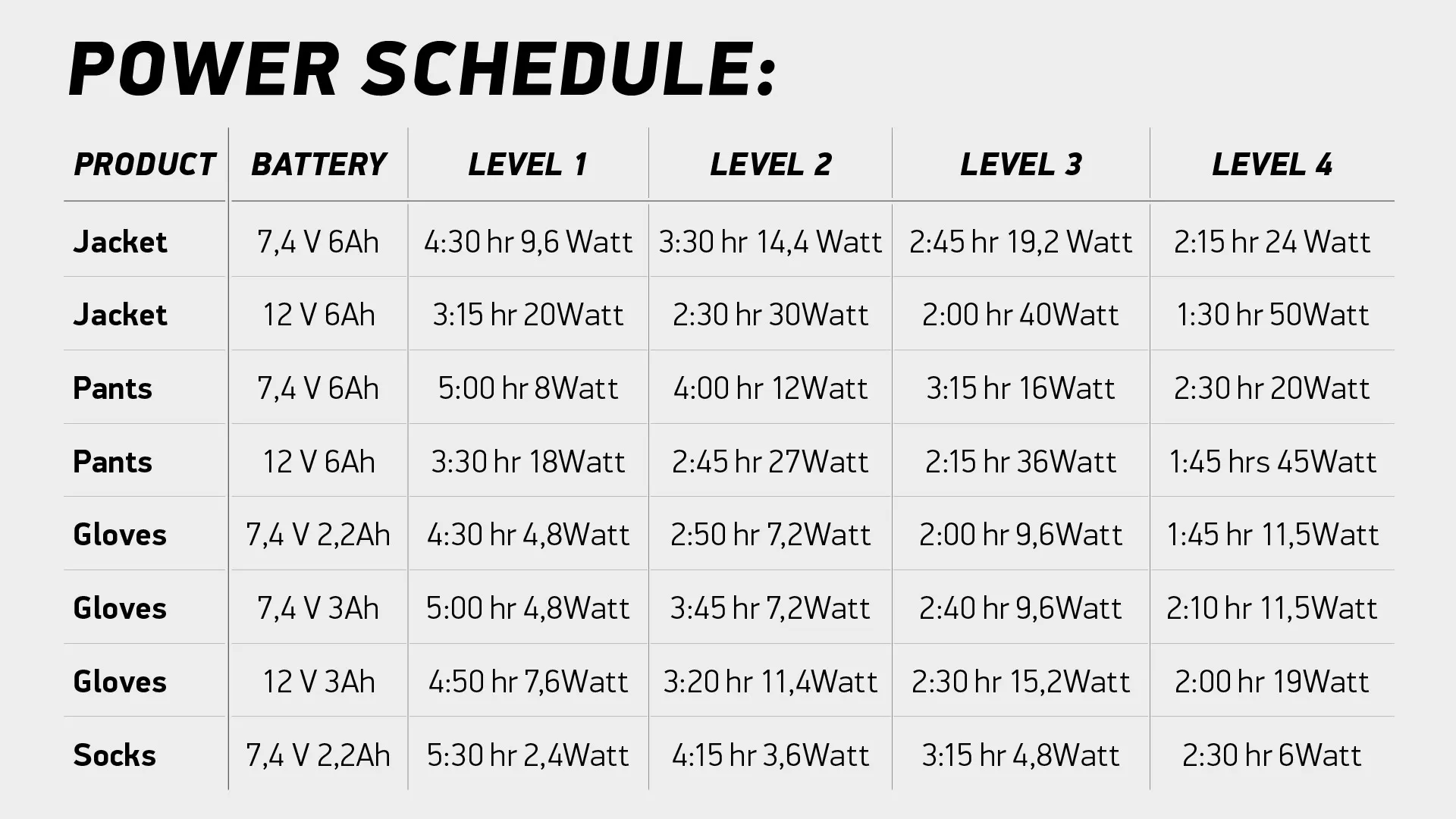 Při výběru baterie pro oděv této velikosti doporučujeme zvolit baterii 6 A, ideálně s napětím 12 V. Alternativou je baterie 7,4 V – 6 A nebo přímé připojení k baterii motocyklu. To zajišťuje neomezený přísun energie, který je často 12 V.
