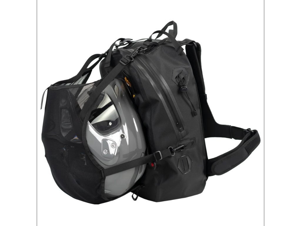 Praktickým prvkem je integrovaná síťovaná kapsa na helmu, do které lze uložit i integrální helmu – ideální řešení při pohybu po městě nebo na cestách. Ramenní popruhy jsou připraveny pro magnetické uchycení vodotěsného pouzdra na telefon, takže máš telefon vždy po ruce a chráněný před deštěm.