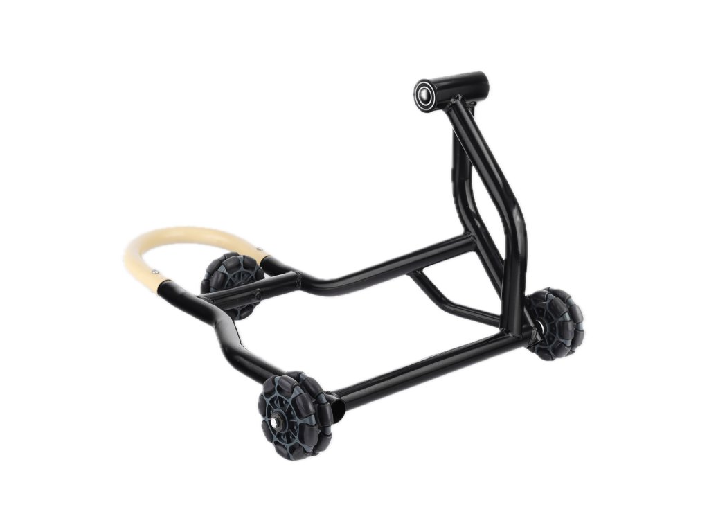 Konstrukce stojanu je z ocelové trubky o průměru 38 mm s práškovou povrchovou úpravou, která zajišťuje vysokou odolnost proti korozi a dlouhou životnost. Multiwheel kolečka umožňují plynulý pohyb motocyklu ve všech směrech, což je ideální pro servis, údržbu i přesné parkování v garáži či dílně. Stojan váží 11 kg, je stabilní a zároveň snadno manipulovatelný.
